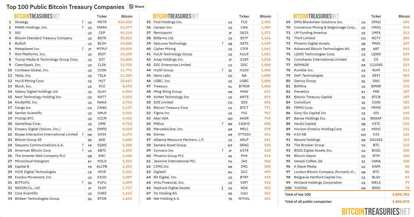 Corporate treasuries followed. Strategy, formerly MicroStrategy, had pioneered the model years earlier, but now dozens of companies announced their own Bitcoin treasury strategies. Some were legitimate businesses diversifying reserves. Many were shells hoping to replicate Strategy’s stock price magic. By some counts, over 172 publicly traded companies now hold Bitcoin on their balance sheets.