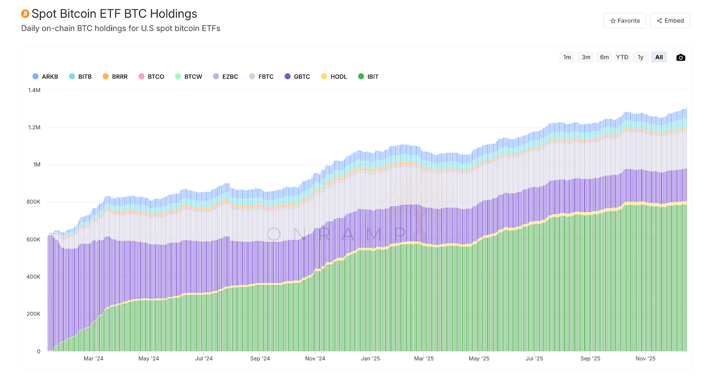 Then came January 2024. The SEC approved the spot Bitcoin ETFs. BlackRock, Fidelity, and a dozen other asset managers suddenly had products to sell. And within months, these ETFs accumulated hundreds of thousands of Bitcoin. By mid 2025, total ETF assets under management peaked at around one hundred fifty two billion dollars, and total coins held crossed 1.3 million.