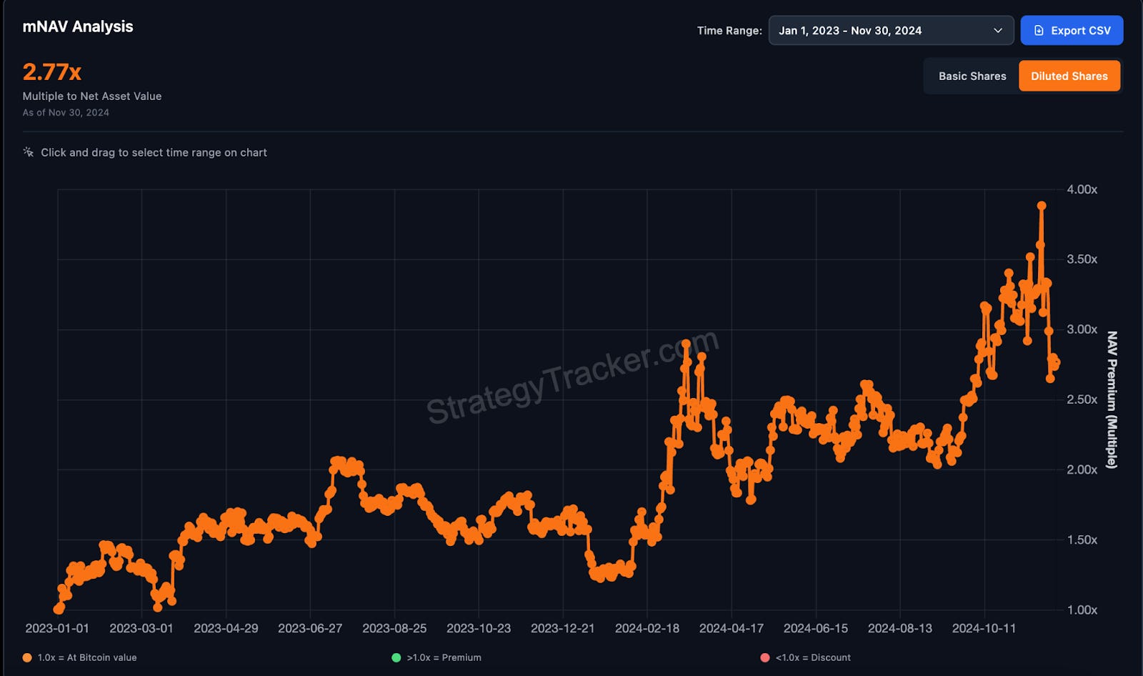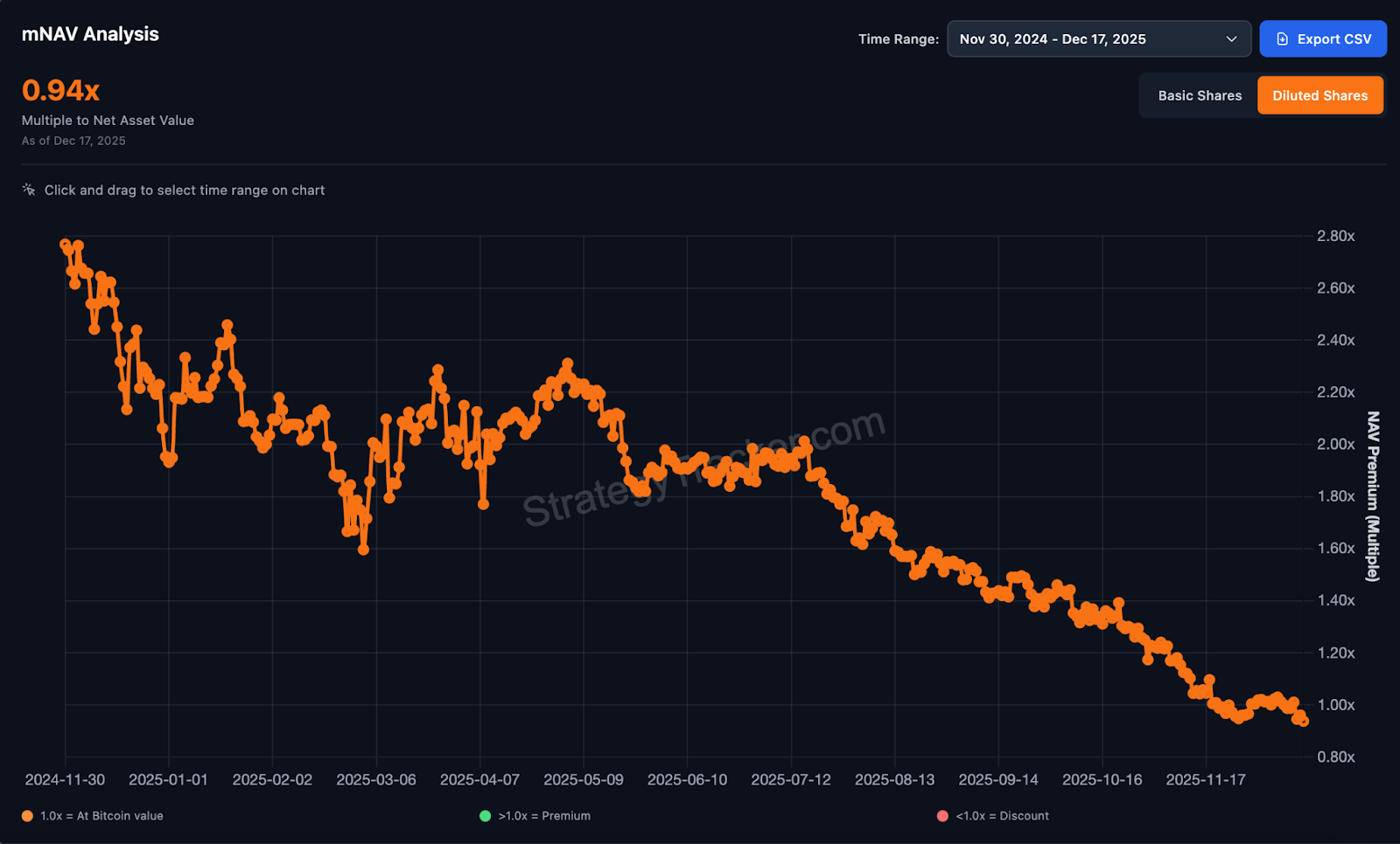 November 2024 marked the peak, when mNAV hit 3.4x. One year later, it collapsed below 1.0. For the first time since 2022, Strategy’s market cap fell below its Bitcoin holdings.