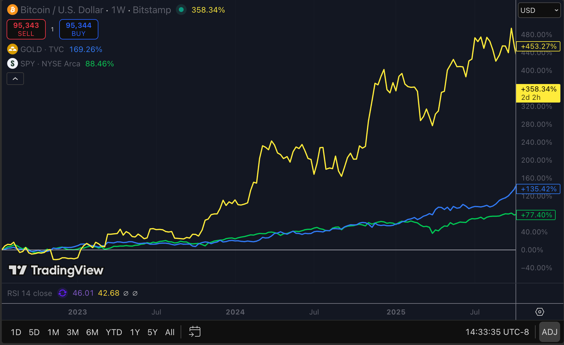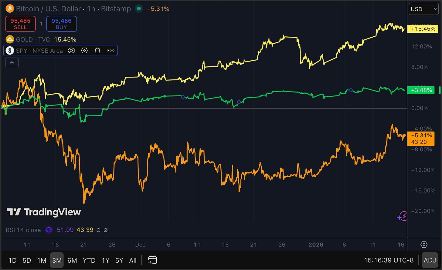 (Bitcoin in orange, Gold in Yellow, SPY in Green- 3 month chart)