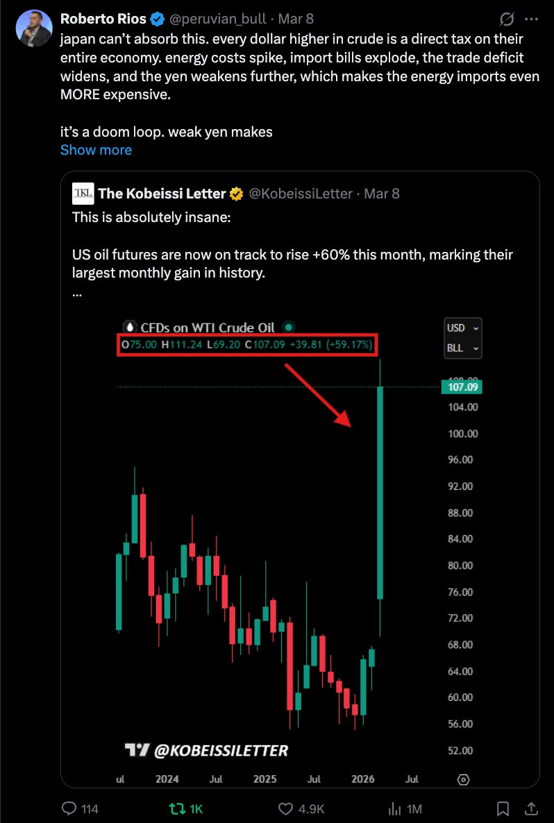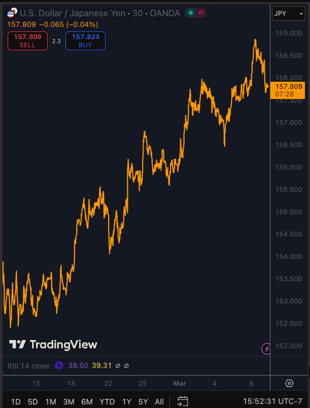 Crude oil crossed $100 a barrel this week for the first time since 2022. On Sunday night, the yen blew past 158.5 to the dollar, hitting six-week lows before retracing slightly. Japanese refiners, staring down the barrel of an energy crisis unlike anything they’ve faced in half a century, are begging the government to crack open the strategic petroleum reserve. This morning it crossed 159.