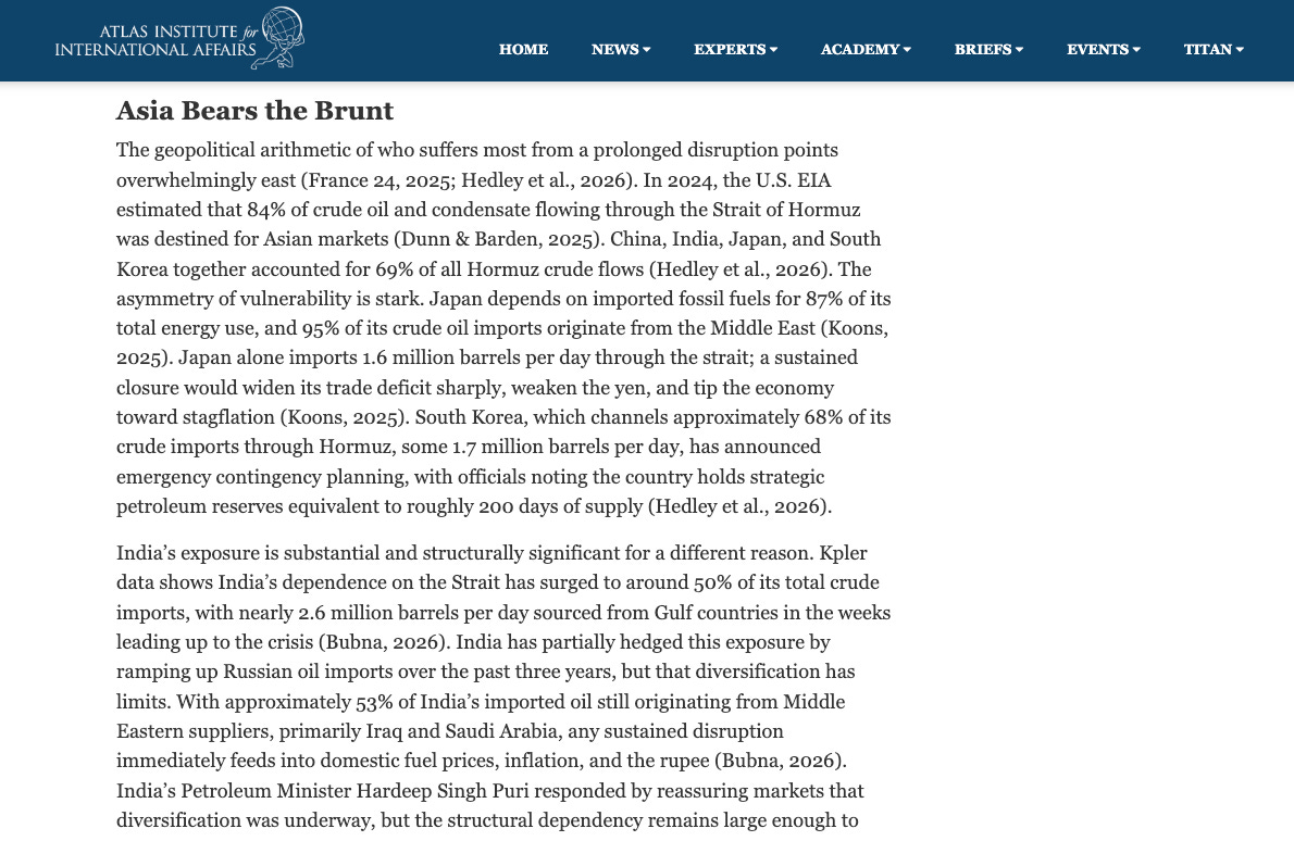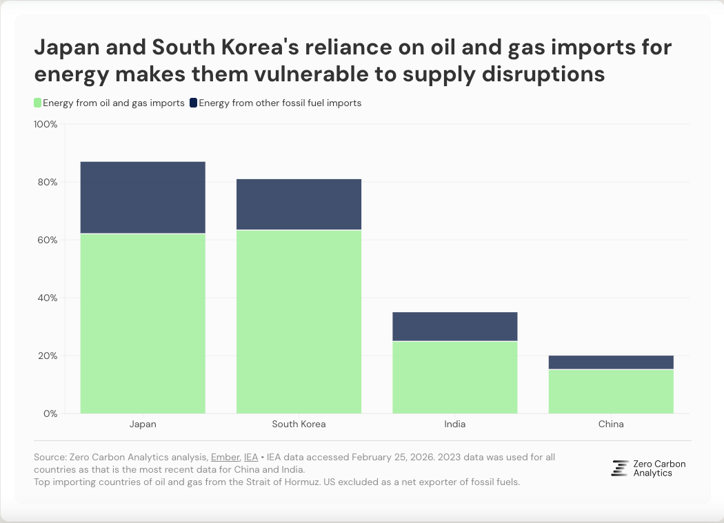 The numbers are stark. According to the Atlas Institute for International Affairs, Japan imports 1.6 million barrels of crude oil per day through the Strait of Hormuz alone. That’s roughly 72% of all Japanese crude oil imports passing through a 21-mile-wide chokepoint that is now, for all practical purposes, a war zone. Zero Carbon Analytics, in a vulnerability analysis published just before the crisis escalated, ranked Japan number one among major economies for risk of supply disruption from the Strait, with a composite risk score of 6.4, well above South Korea , India , and China.