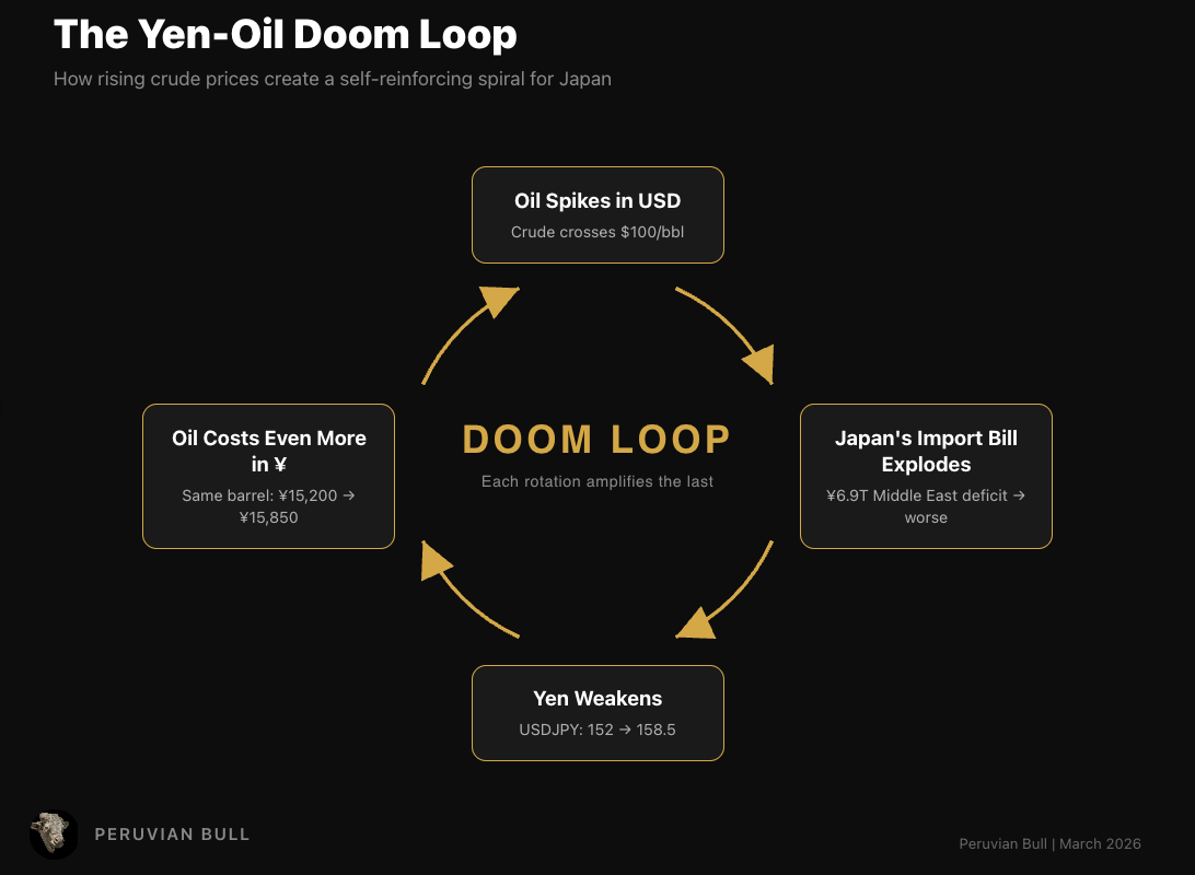 Step three (and this is where it gets vicious): a weaker yen means the same barrel of oil, priced in dollars, costs even MORE in yen terms. When USDJPY was at 152, a $100 barrel of crude cost ¥15,200. At 158.5, that same barrel costs ¥15,850. That’s a 4.3% increase in yen-denominated energy costs on top of whatever the dollar-denominated price increase already was. So the trade deficit widens further. Which weakens the yen further. Which makes the next barrel even more expensive.