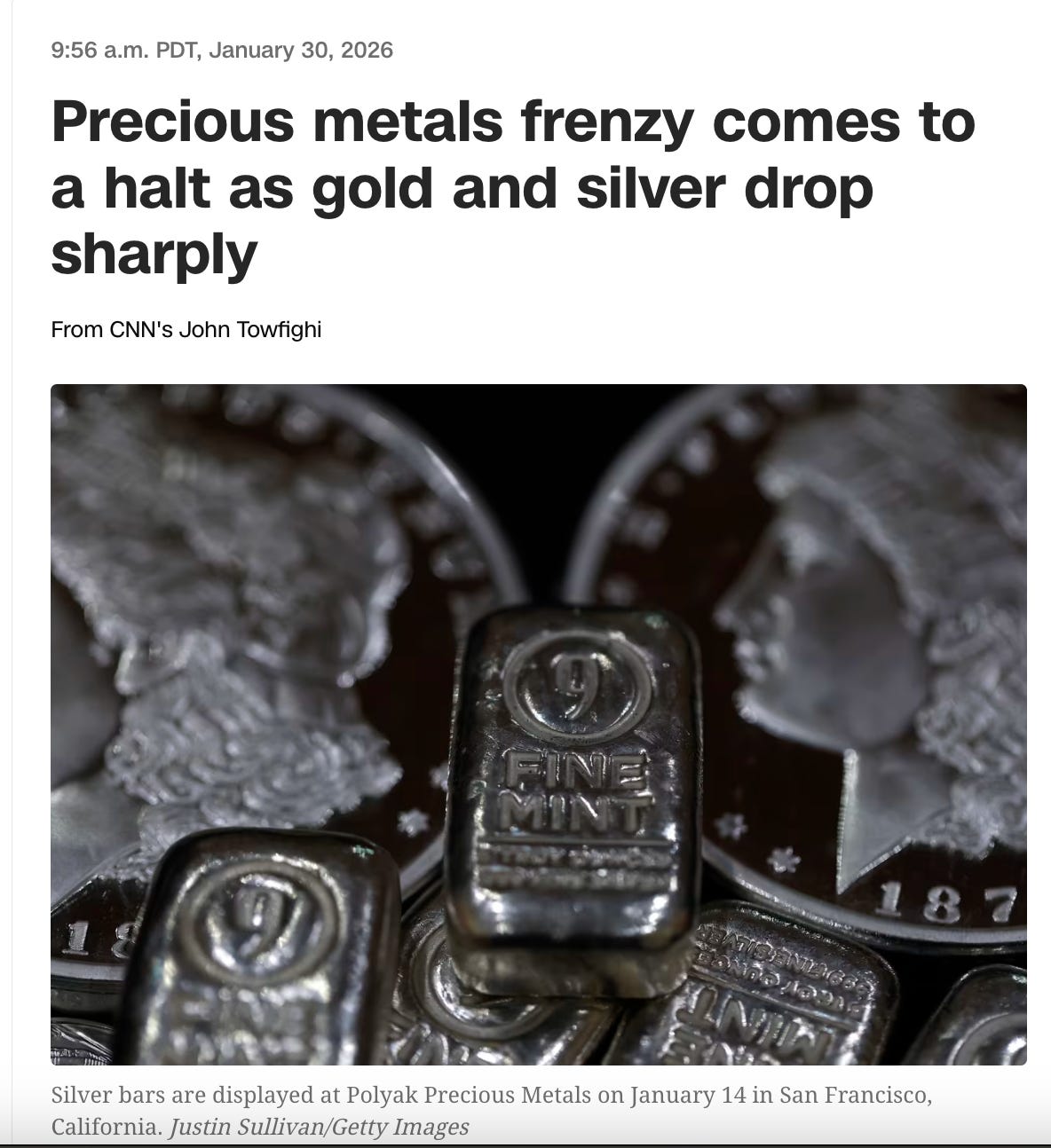 Gold got slaughtered on announcement day, and the logic was straightforward: a credible, hawkish-sounding chair reduces the perceived probability of imminent money printing. But for readers of this Substack, I’d caution against reading too much into the move.