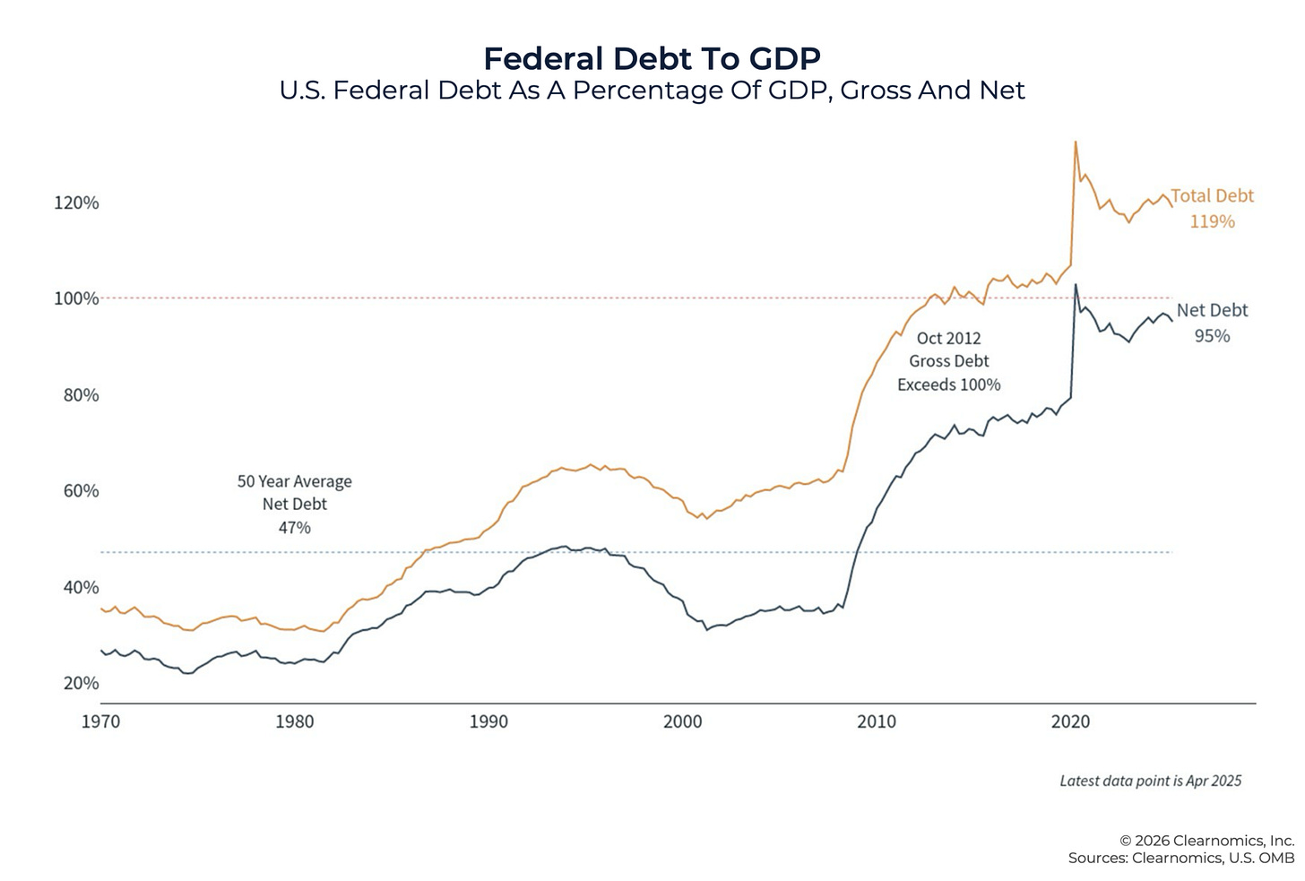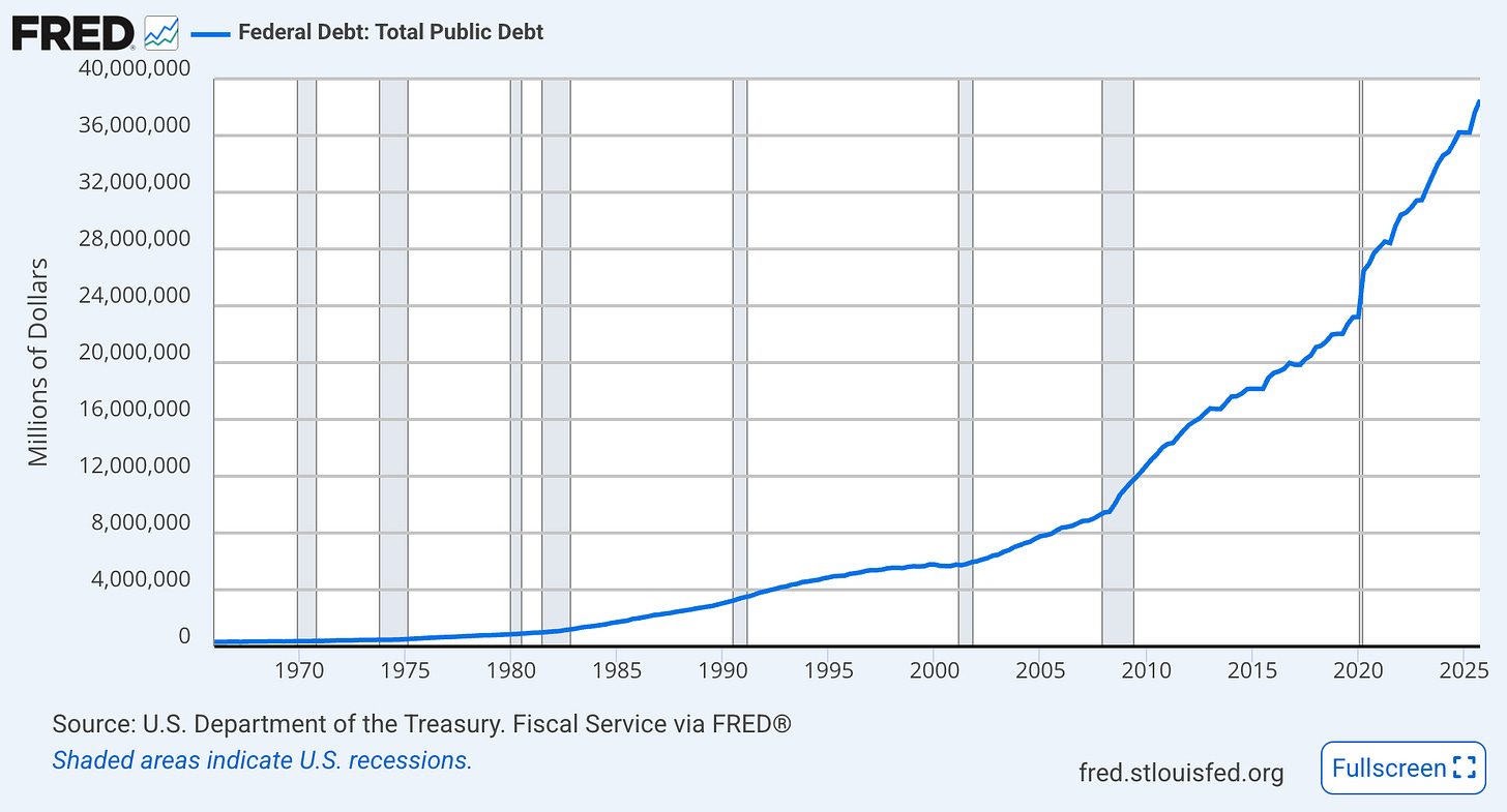 Here’s where the Dollar Endgame thesis collides directly with the Warsh vision. Federal debt is approaching $40 trillion. Annual interest costs run roughly $1.6 trillion. The Treasury borrows close to a trillion dollars every quarter. We’ve crossed the Rubicon into fiscal dominance, though nobody wants to admit it.
