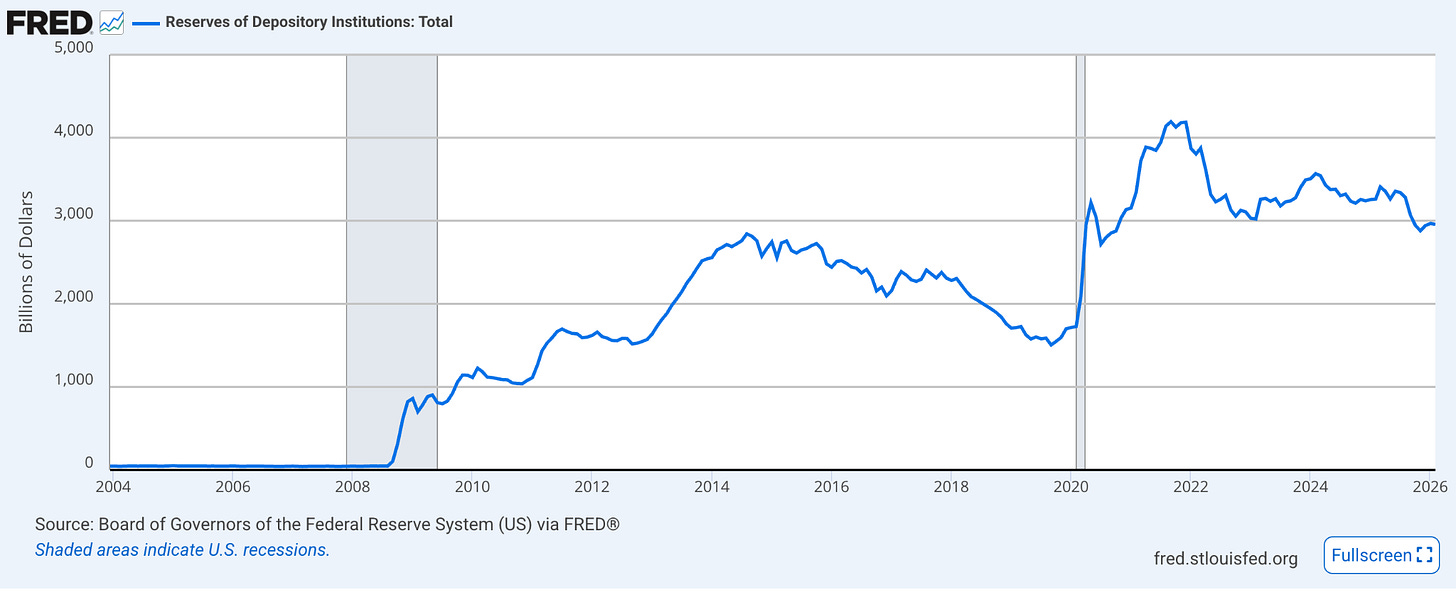 If the Fed stops absorbing Treasuries, someone else has to. With foreign central banks rotating out of long duration US debt and domestic institutional demand structurally constrained, pulling the Fed’s bid at the exact moment the Treasury is issuing record quantities of new debt is a recipe for a bond market dislocation. Dallas Fed researchers published an essay last week showing that returning to scarce reserves would mean running reserves from 9.5% of GDP to below 7%: the level that triggered the 2019 repo market meltdown. They warned that “episodes of money market volatility will likely become more frequent.”