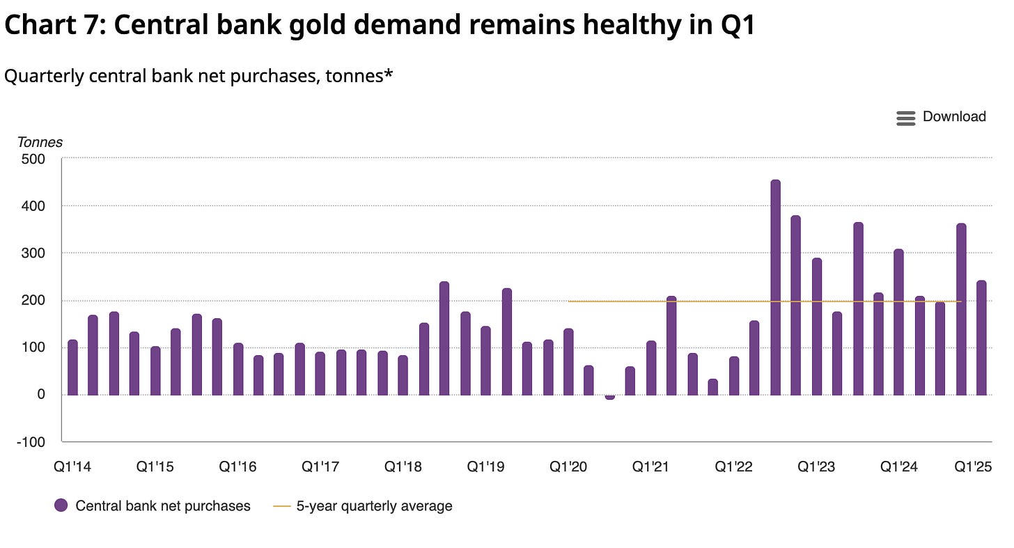Central banks purchased 1,086 tonnes of gold in 2024, marking the third consecutive year above 1,000 tonnes and representing a fundamental shift in how sovereign actors view reserve management. To put this in perspective, this is roughly double the 500-600 tonne average central banks purchased annually in the decade prior to 2022. In Q1 2025 alone, central banks added 244 tonnes, the strongest first quarter on record.