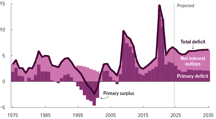The United States is now running deficits that would have been unthinkable outside of wartime just a decade ago. The federal deficit for fiscal year 2024 reached $1.8 trillion, or 6.4% of GDP. The Congressional Budget Office projects that deficits will remain between 5.5% and 7.1% of GDP through 2034, with debt held by the public reaching 122% of GDP by 2034.