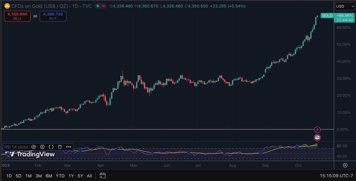The yellow metal is in the midst of one of the most extraordinary runs in modern financial history, surging past $4,300 per ounce on Thursday, a nearly 67% gain year to date. This isn’t just another cyclical rally; it represents the fastest sustained appreciation since the 2008 global financial crisis.