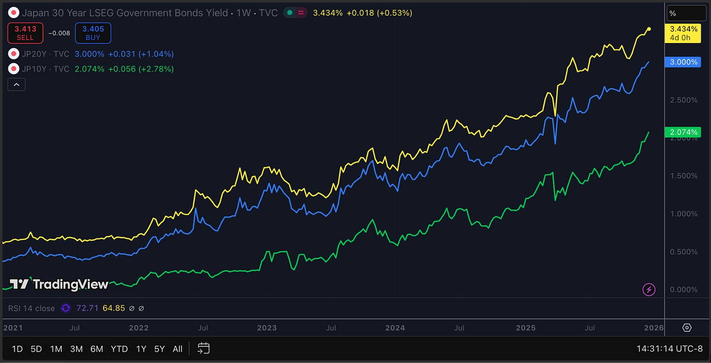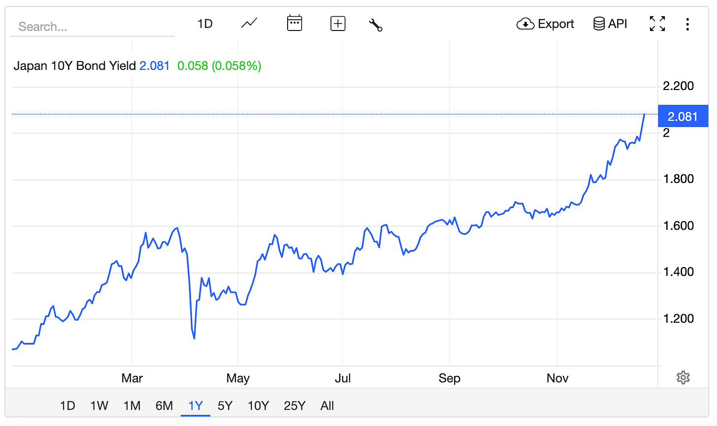 This week, Japan’s 10 year government bond yield crossed above 2% for the first time in twenty six years following the Bank of Japan’s December rate decision, reaching levels not seen since 1999. The benchmark 10 year yield has gained more than 90 basis points over the past twelve months, a staggering move for an instrument that barely budged for most of the previous decade.