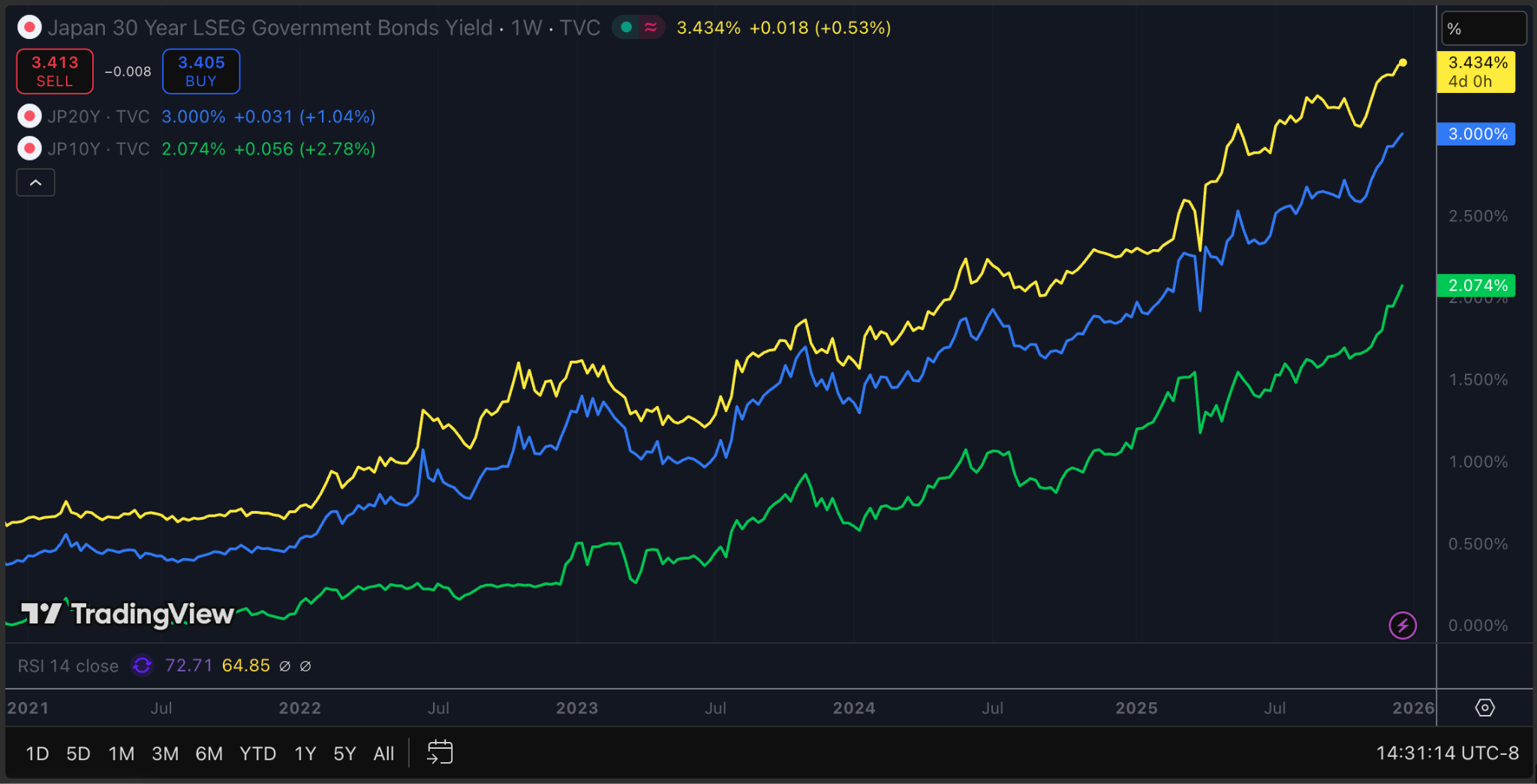 Even the short end has moved sharply. Japan’s 2 year yield rose to its highest level since 2008 following comments from BoJ Governor Kazuo Ueda that brought a December rate hike into focus. The 5 year yield reached a 17 year high. The entire Japanese yield curve has been repriced, and the repricing is accelerating.