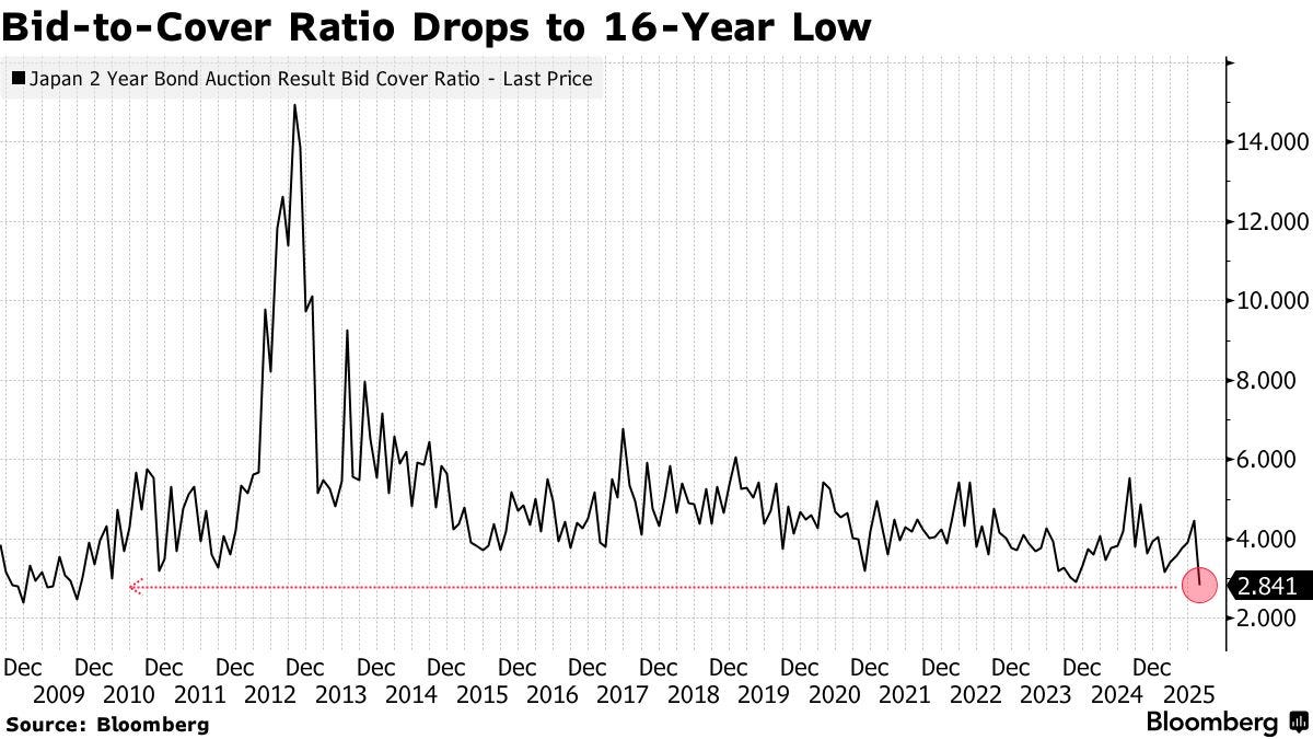 The clearest evidence of market stress came in May 2025, when Japan’s 20 year bond auction attracted the weakest demand since 2012. The “tail” on that auction, measuring the difference between the lowest and average accepted prices, reached its widest level since 1987, a clear signal that buyers were demanding significant concessions to take down the debt.