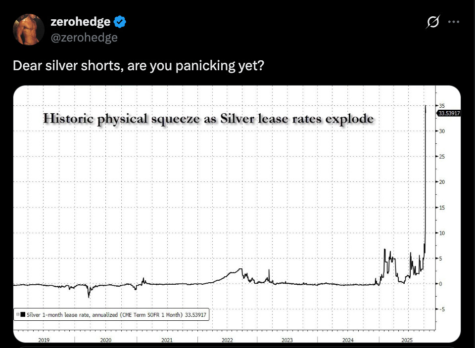 Perhaps more telling: this is the fifth time this year silver borrowing costs are above 5%, representing a 500% surge from the historical near-zero levels.